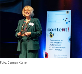 Zu den aktuellen Forschungsvorhaben gehört ein Projekt, das für die Buchbranche ausgesprochen interessant ist: „Generative KI und kreative Autorschaft in Wissensarbeit und Literatur“. Als Fellow wurde Autorin Nina George an Bord geholt, zugleich Ehrenpräsidentin des European Writers‘ Council. Sie füllt das Projekt mit Leben – ein Baustein war das breit angelegte Symposium.